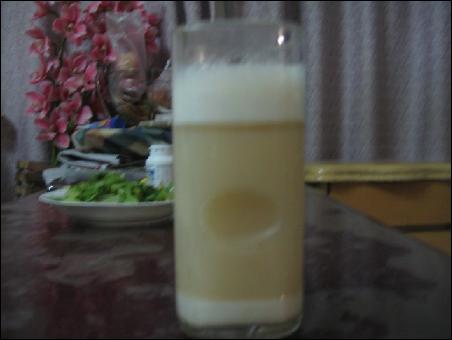 又買回一節(jié)藕,要買新鮮的老藕,那樣的淀粉才多。去掉藕節(jié),榨汁過后,老老實(shí)實(shí)等淀粉沉淀下來,發(fā)現(xiàn)沉淀下來的最底部是純白色的,中間是淡黃色粉狀,在上面就是水,把最上面藕汁喝掉,甘甜可口,比就這樣喝藕汁爽口多了。