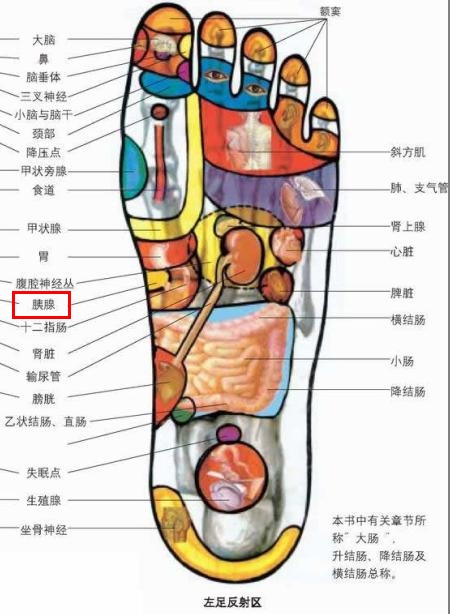這是一張左足的反射區(qū)圖,昆叔告訴我,點按那個黃色的胰腺反射區(qū),如果被按摩者感覺痛,那就說明胰腺有問題。當(dāng)然,右腳相應(yīng)的區(qū)域點按也同樣。