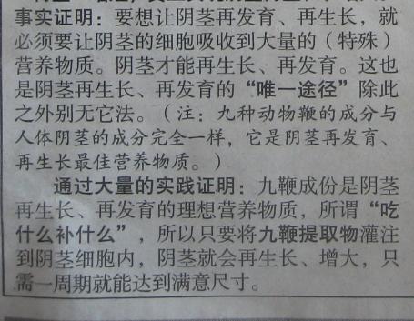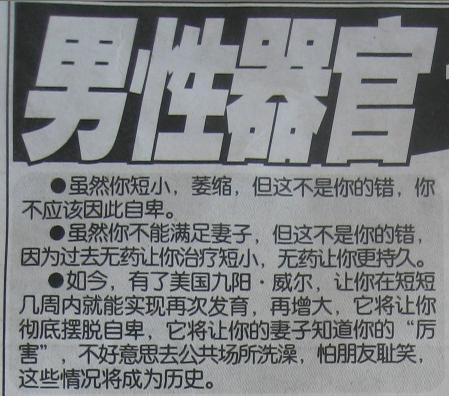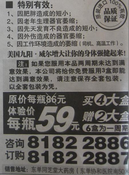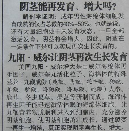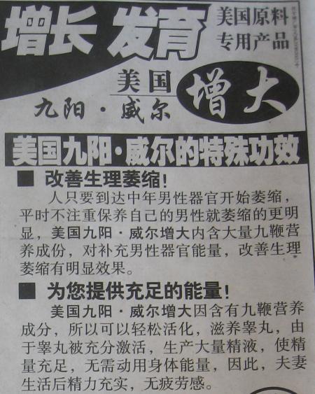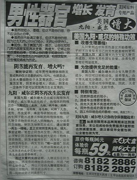 但是,胡亂刊登醫(yī)療廣告,豈只是互聯(lián)網(wǎng)上的事,在報紙上也毫不含糊。這不,近日<法制晚報>連續(xù)刊出這類廣告:“吃美國九陽威爾,能讓男性器官增大”。