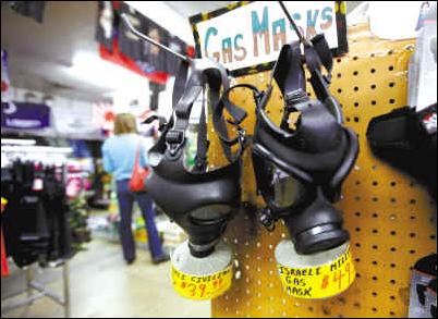 圖三:3月18日,美國洛杉磯,消費(fèi)者在軍需商店選購防毒面具等商品。