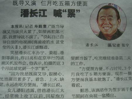 在這一篇新聞報(bào)道中,記者這樣寫(xiě)道:既導(dǎo)又演,仨月吃五箱方便面,潘長(zhǎng)江喊“累”。
