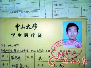 “太可惜了,明天就是他26歲的生日了!” 昨日下午,從廣東湛江趕來的戚錦典的親屬默默凝視著他的死亡醫(yī)學(xué)證明書說。昨日,他們將戚錦典的遺體送至中山大學(xué)法醫(yī)鑒定中心進行尸檢,家屬認為負責救治的醫(yī)院在治療過程中有過失,導(dǎo)致了戚錦典的死亡。