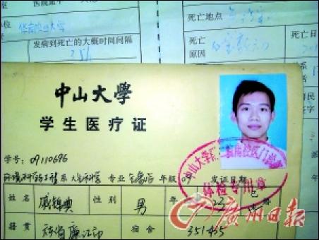 今年4月11日上午7時許,中大環(huán)境學院在讀博士生戚錦典因發(fā)熱、頭暈乏力到廣州新海醫(yī)院就醫(yī),院方的診斷是:發(fā)熱查因,按照一般感冒發(fā)熱治療。戚錦典門診輸液后回了學校,下午出現(xiàn)了嘔吐。
