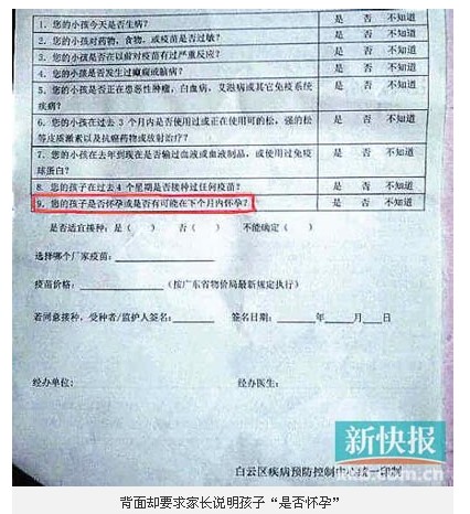 【byb.cn】?(摘自:搜狐健康網(wǎng))近日,白云區(qū)街坊曾先生遇到一件怪事:他收到一張《小兒七價(jià)肺炎球菌結(jié)合疫苗接種知情同意書(shū)》,背面有9個(gè)問(wèn)題要填寫(xiě),其中第9條是“您的小孩是否懷孕或是否有可能在下個(gè)月懷孕?”對(duì)于這樣的問(wèn)題,而曾先生的小孩才一歲半,他直呼“離譜”。