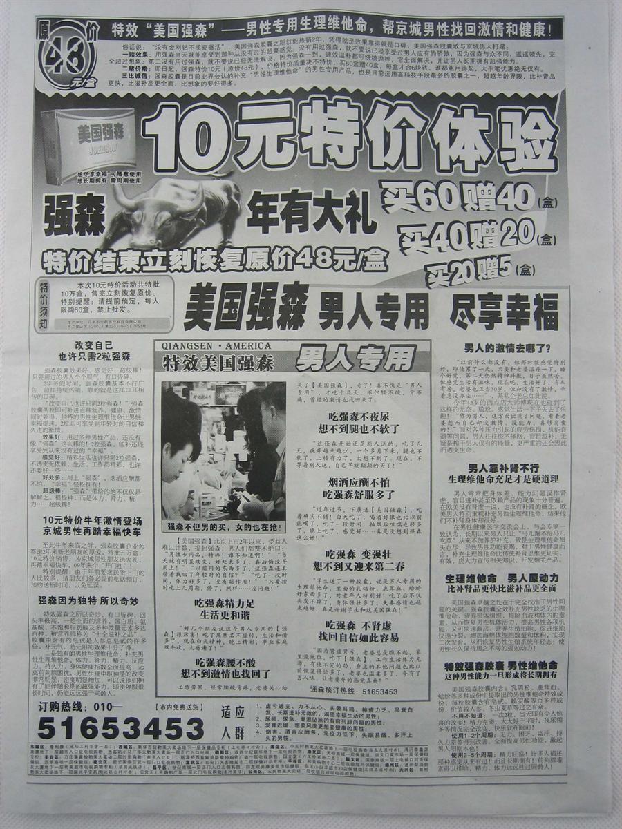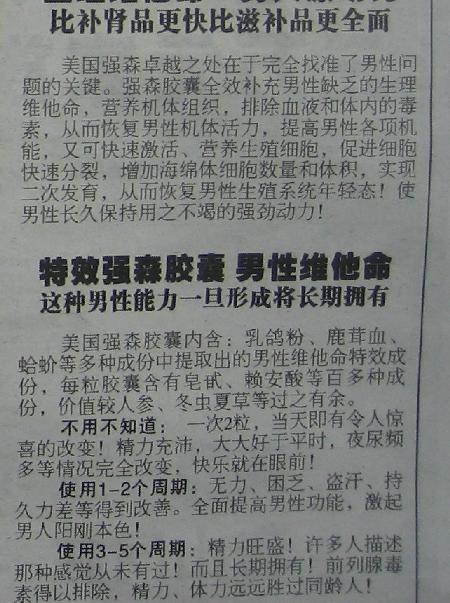 今天,我們要說(shuō)說(shuō)《法制晚報(bào)》上刊登的美國(guó)強(qiáng)森膠囊,號(hào)稱(chēng)男性專(zhuān)用生理維他命,幫助男性找回激情和健康。那這是一個(gè)什么東西呢,其實(shí)就是一個(gè)類(lèi)似偉哥的產(chǎn)品,甚至還強(qiáng)似偉哥。