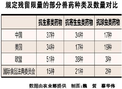 關(guān)于殘留限量標(biāo)準(zhǔn),各國(guó)在藥物品種設(shè)置上有差別。如抗生素類藥物:歐盟51種,美國(guó)34種, CAC15種,中國(guó)37種;抗寄生蟲(chóng)類藥物:歐盟38種,美國(guó)17種,CAC21種,中國(guó)34種;抗球蟲(chóng)類藥物:歐盟3種,美國(guó)19種,CAC2種,中國(guó)17種。