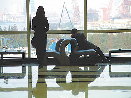 圖為兩位白領(lǐng)在上海商務樓大廳中休息。據(jù)2004年12月中國人壽保險股份有限公司提供的一份白領(lǐng)健康調(diào)查報告顯示,現(xiàn)代白領(lǐng)普遍面臨“亞健康”和“低心理商數(shù)”雙重健康威脅。尤其在京滬穗等地,認為自己身體、心理等各方面均健康的白領(lǐng)不足5%。
