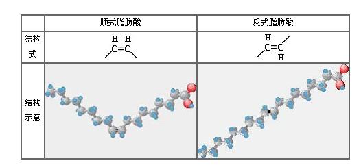 不飽和脂肪酸根據(jù)碳鏈上氫原子的位置,又可以分成兩種,如果氫原子都位于同一側(cè),叫做“順式脂肪酸”,鏈的形狀曲折,看起來(lái)象U型;如果氫原子位于兩側(cè),叫做“反式脂肪酸”(trans-fattyacids),看起來(lái)象線形。