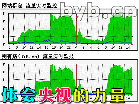 第三波,帶寬:大約2點(diǎn)多,公司的網(wǎng)管大海跑過來和我說,站長(zhǎng),你的BYB怎么回事,流量異常高,編輯們的后臺(tái)都打不開了。我說,大概是央視的功勞吧。于是馬上打開流量監(jiān)控,媽呀,嚇了我一跳,獨(dú)享的帶寬完全占滿了。原來,BYB和走進(jìn)中關(guān)村是共用的一個(gè)帶寬,平常,BYB最多占用四分之一的流量,但這次,BYB占了三分之二的流量,怪不得編輯抱怨后臺(tái)打不開呢。于是,技術(shù)部領(lǐng)導(dǎo)馬上和IDC商量,1小時(shí)后,總帶寬增加了近一倍。這時(shí),后臺(tái)到是能打開了,但是,BYB的流量又再次占了新擴(kuò)之后總流量的五分之三,而且總流量始終不減。