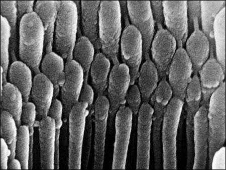這張圖片看起來好像是在耳朵里面對耳毛細(xì)胞進(jìn)行近距離觀察時拍攝的。耳毛細(xì)胞的主要功能是發(fā)現(xiàn)對聲震作出反應(yīng)時產(chǎn)生的機械運動。