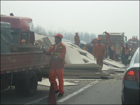 等我們開(kāi)到跟前才發(fā)現(xiàn),一輛拉著板材的大貨車(chē)從對(duì)面車(chē)道上沖破隔離帶,騎在了上面,板材撒滿了一地,把雙方向的車(chē)道全堵住了。尤其是從北京往天津方向的三條道,被占了兩條,你說(shuō)能不堵嗎?
