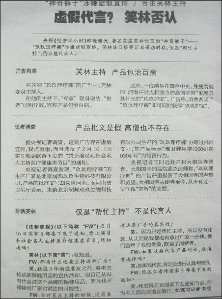 下面是影星笑林代言的玖玖理療褲的相關(guān)資料,而這款卡卡魔力褲和玖玖理療褲騙人的招數(shù)幾乎是如出一轍。