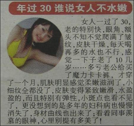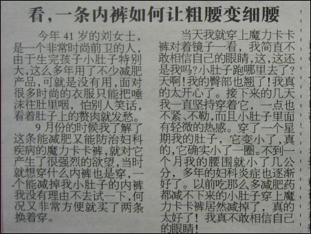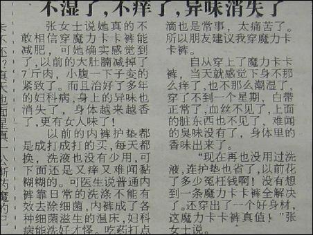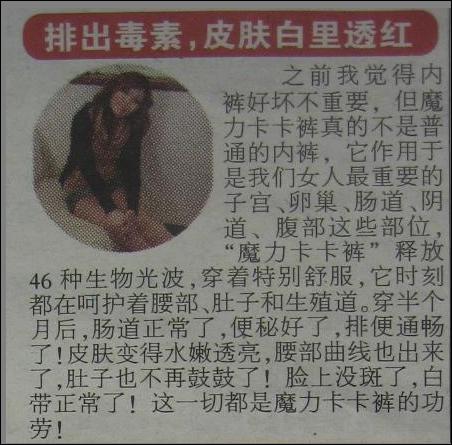 【byb.cn XJ】 3.15剛過,虛假廣告又卷土重來。這不,3月21日的《法制晚報(bào)》,又拋出一系列的虛假廣告,其中最引人注目的就是魔力卡卡褲,聲稱能解決所有婦科疾病。