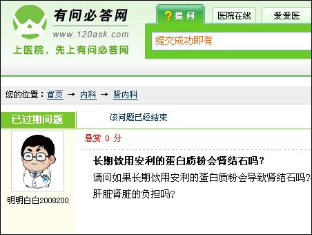 在有問必答網上(http://www.120ask.com/question/2008-11-11/5234793.htm),在2008年11月11日,曾經有網友問,吃安利的蛋白質粉,會不會得腎結石,得到了醫(yī)師肯定的回答,下面是截圖:
